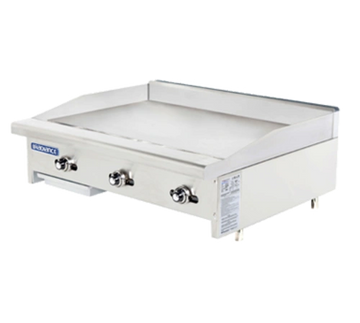 Radiance Griddle, countertop, gas, 36"W x 30"D, stainless steel front & side, built-in stainless steel splash guard, 1" thick highly polished steel griddle plate, (3) burner, aluminized U shaped burners & thermostat controls for every 12", 3" wide front grease trough, removable grease pan, bullnose stainless steel front extension, 2" stainless steel standard legs, regulator included, total 66,000 BTU, CSA, CSA-Sanitation